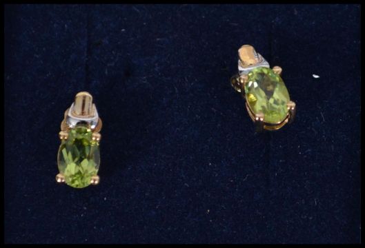 A Demi Parure 9ct gold and peridot set pendant necklace and chain set. Fine linked chain with oval cut claw mounted stone, the earring studs with posts oval cut claw mounted stones. 46cms long chain / total weight 2.2g