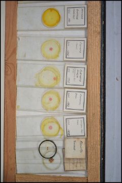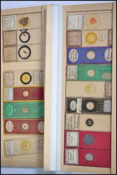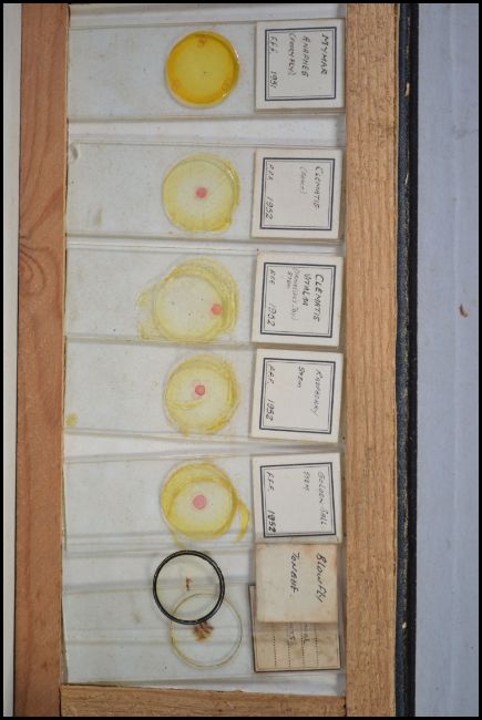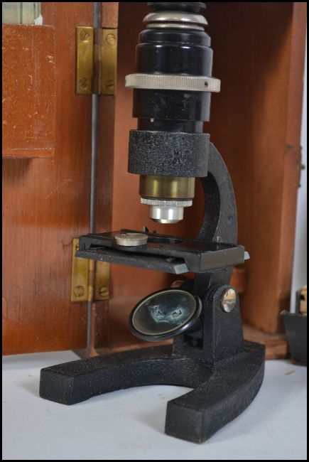 A vintage cased microscope together with a box of scientific glass slides dating from the early 20th century. Measures 20cm high.