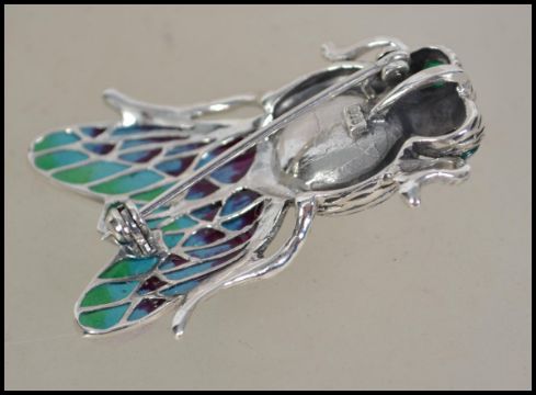 A silver plique a jour bug brooch in the form of a fly with large central freshwater pearl to centre having pin verso. 4cms long / weight 9.7g