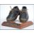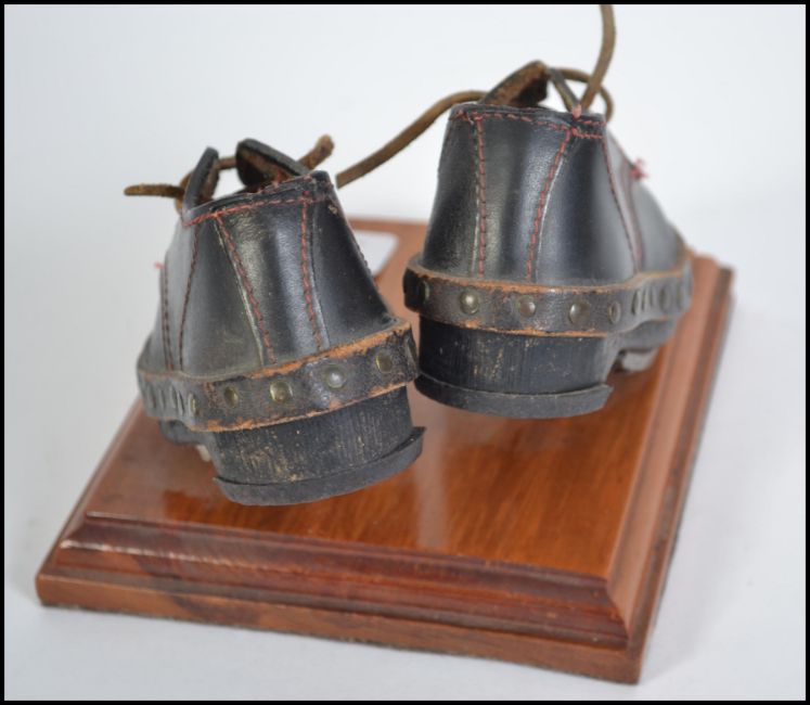 A vintage 20th century pair of children's leather clogs mounted on a wooden plinth marked Lancashire Weavers Clogs. Measures 14cms long.