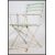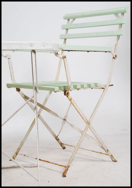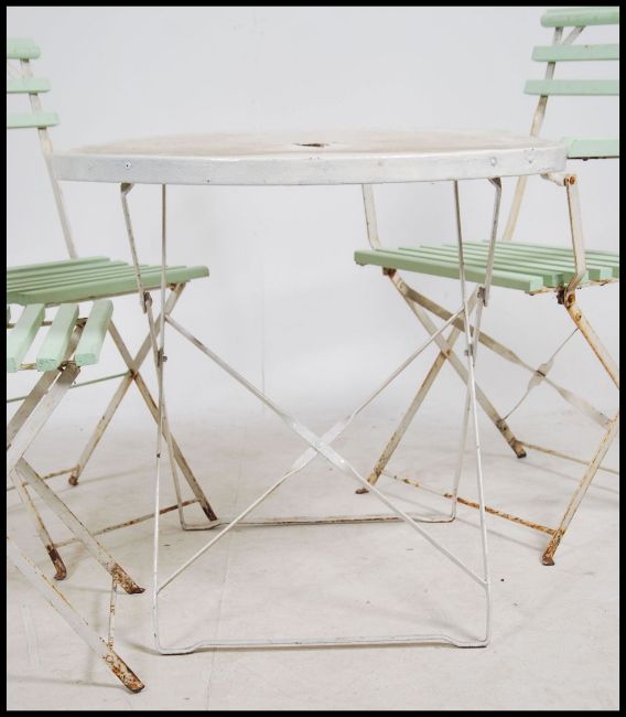 A mid century vintage strap painted cast iron and wooden slatted cafe - patio garden set comprising 3 chairs and a round table all folding. Measurements, 74cm Diameter.