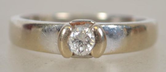 An 18ct white gold ladies single stone diamond ring approx 20pnts to the claw mounted diamond. Total weight 2.8g / Size K
