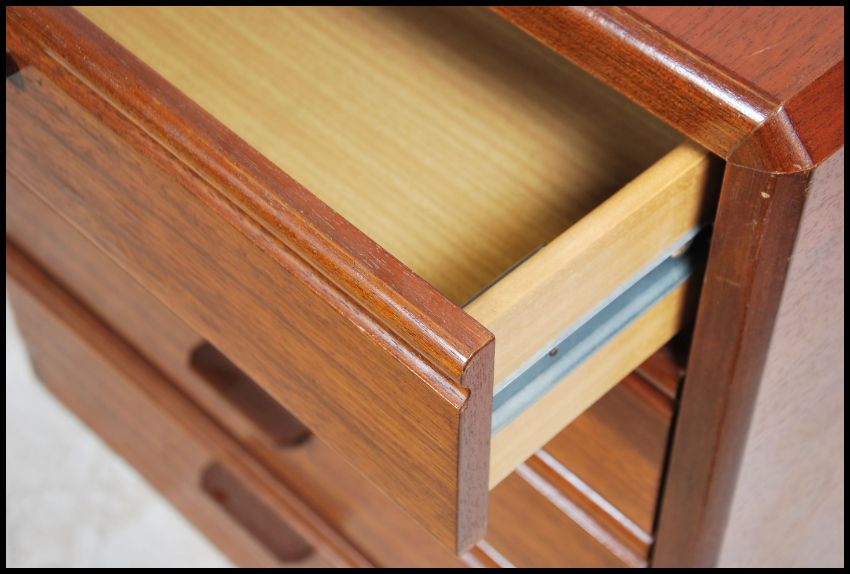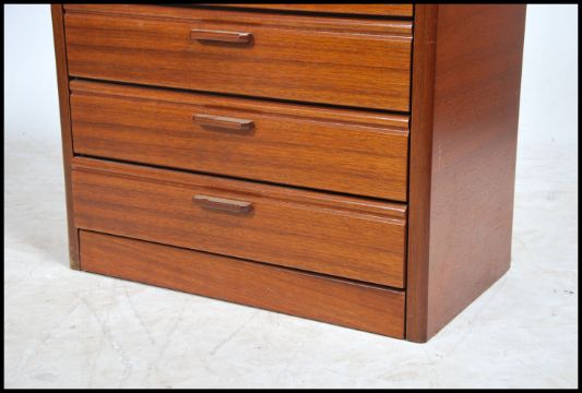 A retro 1970's Hulsta teak wood chest of drawers having an upright pedestal of drawers with shaped handles, the chest with canted corners. Measurements, 76cm high x 67cm wide x 37cm depth (Drawer projection is an extra 25cm).