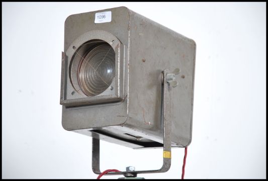 A mid century Industrial Strand Theatre cinema light of metal form with original grey paint being mounted to a wooden tripod stand