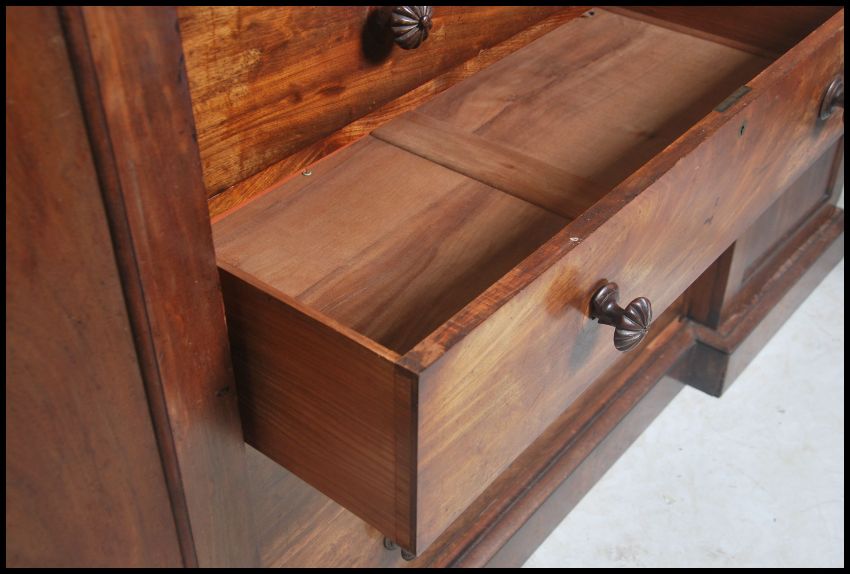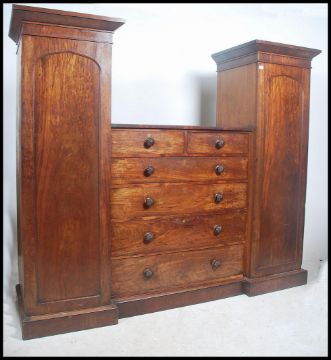 A Regency - Victorian mahogany compactum triple wardrobe combination. Raised on a plinth base having a large central chest of drawers being flanked by sentry box wardrobes either side. The large chest with original knob handles. Finished with flared cornice tops to the wardrobes. Dismantles into 6 pieces for ease of movement. All together measures 186cm high x 220cm wide x 56cm deep.