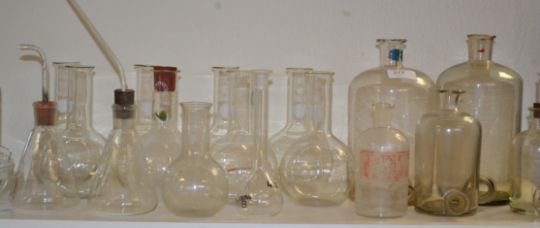 A group of scientific chemical / lab equipment to include various Pyrex boiling tubes and conical flask etc.