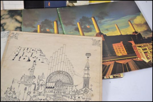 A collection of vinyl long play records 16 in total all by Pink Floyd to include Relics X 2, The Wall X 2, The Darkside Of The Moon X 2, The Final Cut X 2, Obscured By Clouds, Animals X 2, Wish You Were Here, A Collection of Grand Dance Songs, A Momentary Lapse Of Reason, Ummagumma and A Nice Pair.