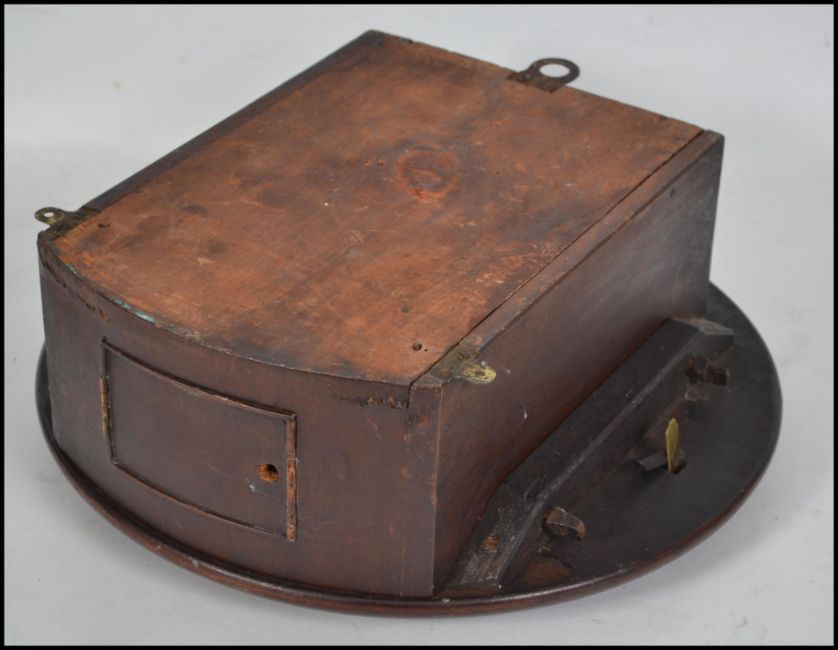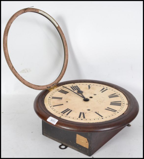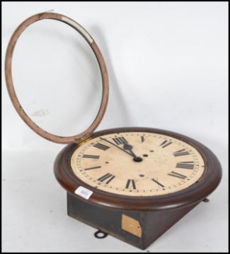 A Victorian fusee movement station - wall factory clock of circular form with mahogany case having large face with roman numeral chapter ring. Brass chain fusee movement with key and pendulum. Measures 38cm wide.