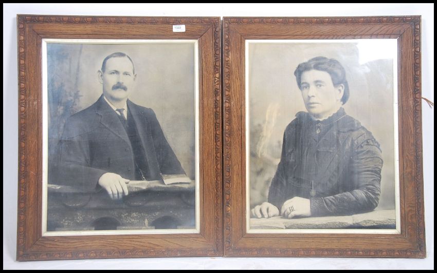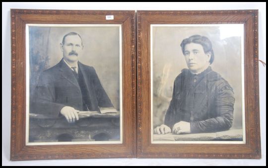 A large pair of vintage early 20th century black and white photographic portrait studies of suited gentleman being set within golden oak frames. Measures 58cm high x 44cm wide.