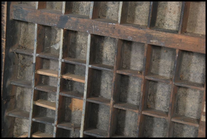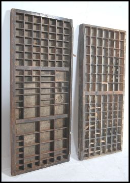 A pair of early 20th century Industrial printers block trays. Each with segmented areas with original pull handles and bases. Measures 82cm wide x 37cm deep.