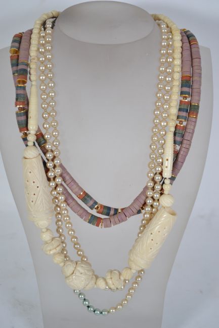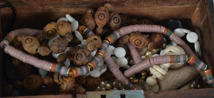 A Georgian mahogany jewellery casket filled with ladies vintage bead necklaces to include murano coloured glass stone beads and many others etc