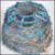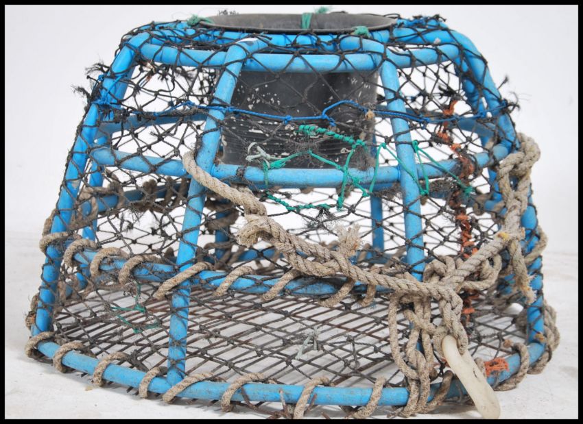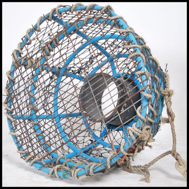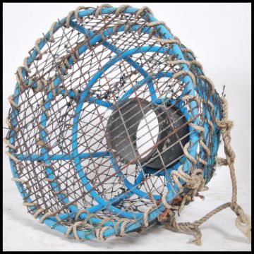 A large 20th century Devon sea fishing lobster / clawfish pot having net and rope present in blue with metal grill base.
