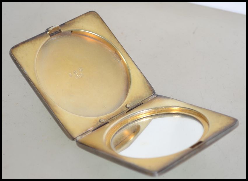 A silver 1930's Art Deco hallmarked enamel engine turned ladies compact by Henry Matthews ? of Birmingham 1930. Total weight 77g.