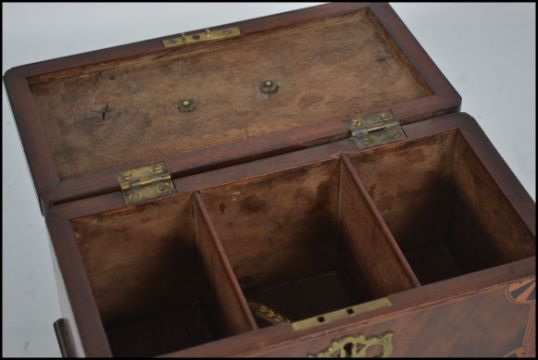 A 19th century Georgian mahogany and crossbanded inlaid tea caddy raised on bracket feet with brass key escutcheon. Atop a hinged lid with swan neck handle opening to reveal 3 section interior.