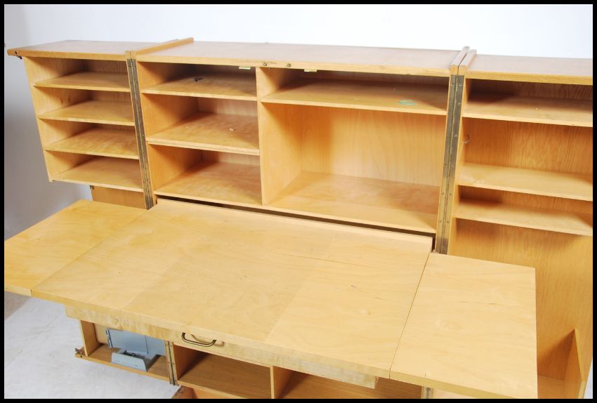 A retro mid century teak wood Danish inspired  Newcraft fold away metamorphic  desk. Having two full length doors opening to reveal a fully appointed interior.. Measures 114cm high x 82cm wide x 55cm deep.