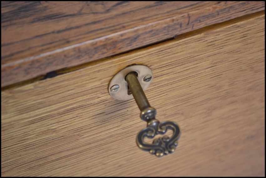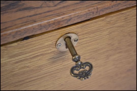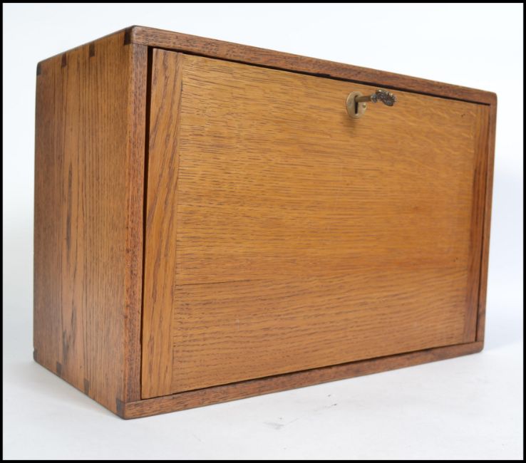 A good 20th century oak engineers / specimin chest having lockable fall front with appointed interior of drawers to include short and deep