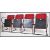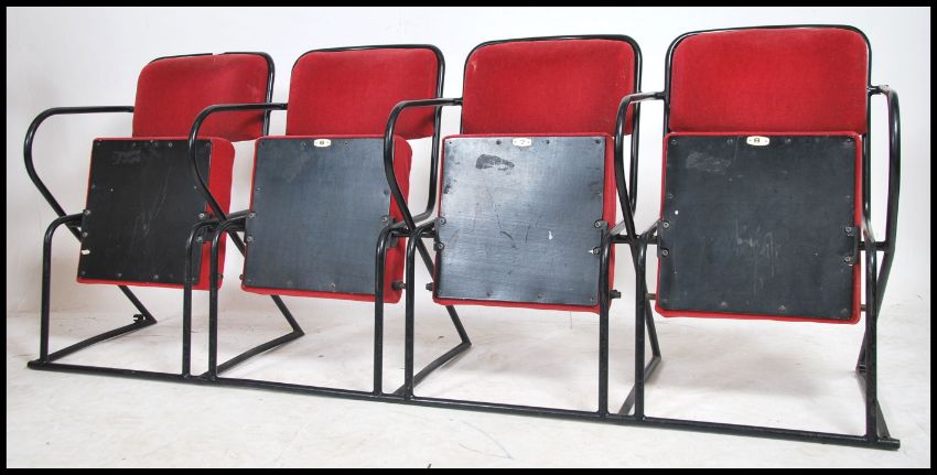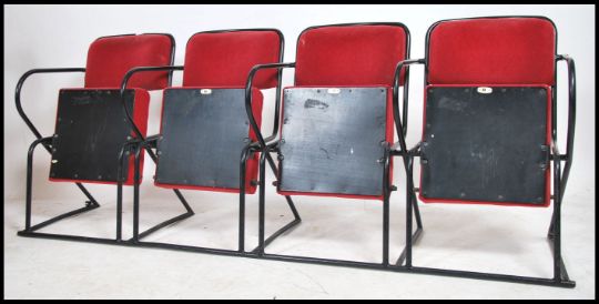 A set of 4 - run of 4 retro 20th century folding cinema chairs upholstered in red moquette fabric and set to a black metal mounted frame. Measures 79cm high x 201cm wide x 57cm deep.
