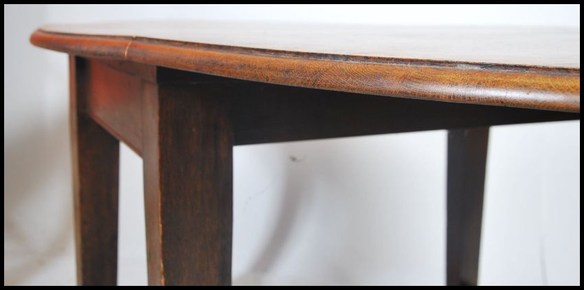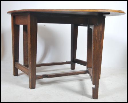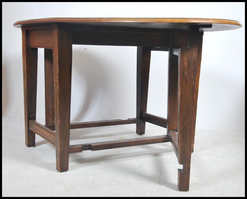 A late 19th century large solid oak Arts & Crafts drop leaf dining table being raised on squared legs united by stretchers having drop leaves atop raised on swing legs