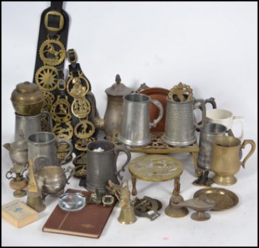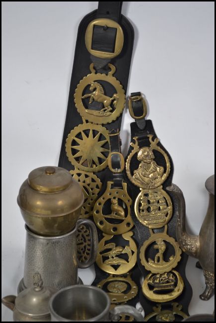 A collection of pewter tankards and horse brasses. To include examples with Nelson / hms victorycetc on the brasses and the tankards - mainly all dating from the 20th century. Some brasses on leather