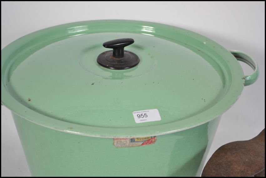 A vintage 1950's enameled kitchenalia steamer / laundry pan with lid , labelled REGINA vitreous porcelain Holloware along with a cast foot set on wooden base, a cobblers tool of some age. Measures 28cm high.
