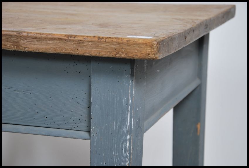An early 20th century painted pine shabby chic farmhouse kitchen cottage dining table raised on squared legs with fitted frieze and planked top above. Measures 89cm high x 117cm wide x 69cm deep.