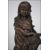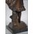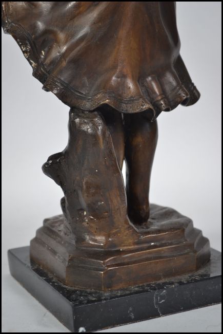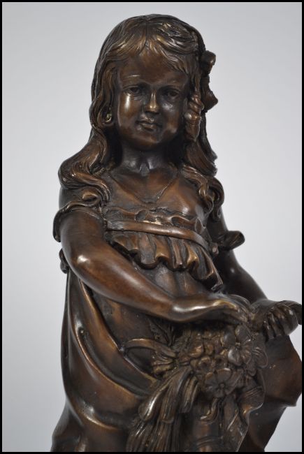 A bronze cast figure / sculpture of a young shoe-less girl holding a bouquet of flowers raised on a square plinth base. Measures 40cm high.