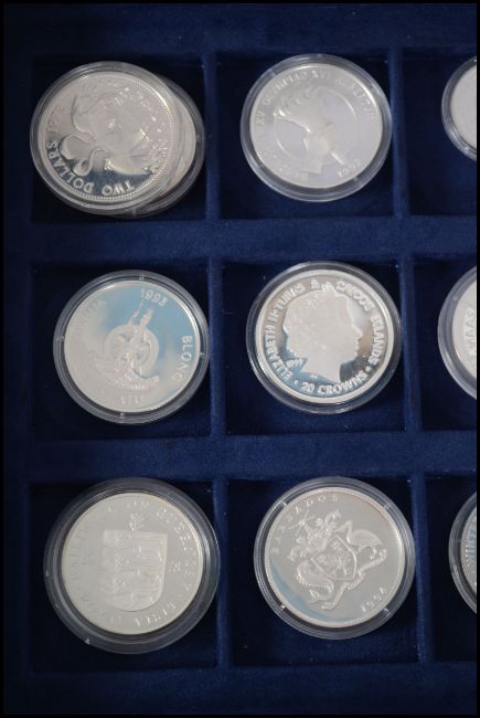 A collection of 12 silver proof coins mostly crown sized some with certificates. Bermuda silver wedding coin, 1992 Barcelona Olympics, Queen mother Barbados coin, Republic of liberia, German silver proof coin, Channel Islands coin, Vanuatu coin, Guernsey coin, Bahamas coin, Winter Olympics etc. All held within a velvet coin collectors case.