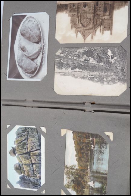 An early 20th century Edwardian postcard album featuring a range of vintage postcards - topographical, real photo, some of military interest and others.