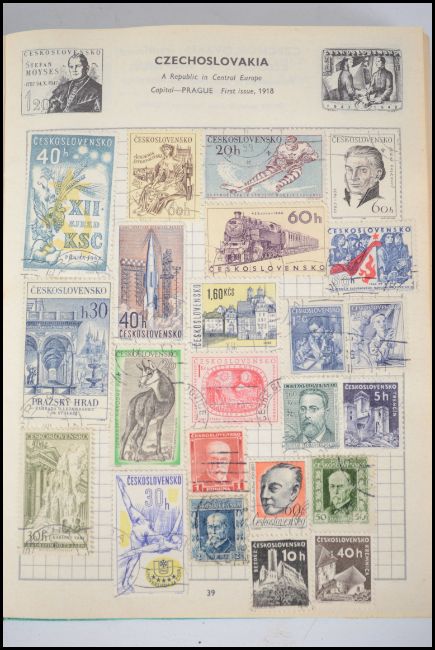 An old stamp album containing many examples to include British Victorian penny red's along with commonwealth and colonies. Also Worldwide to include Argentina,  Japan, Germany occupied, Malta, Spain and many others etc