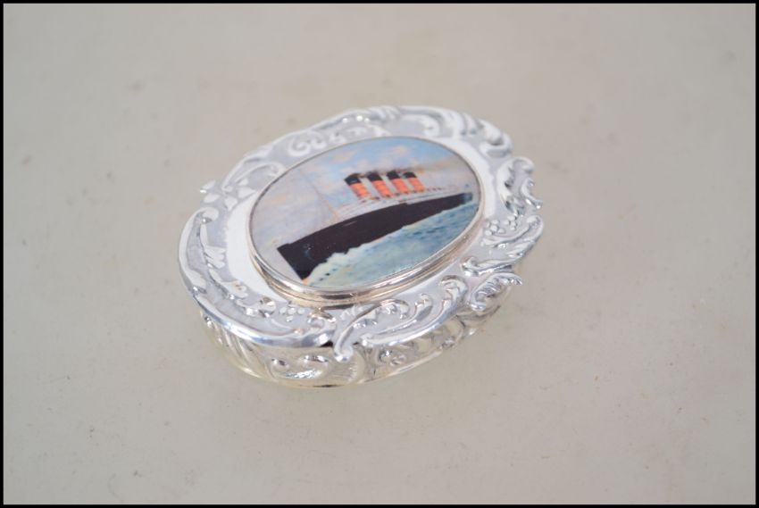 A silver pill box with Titanic image to lid. Marked Sterling. Measures 4.5cms.