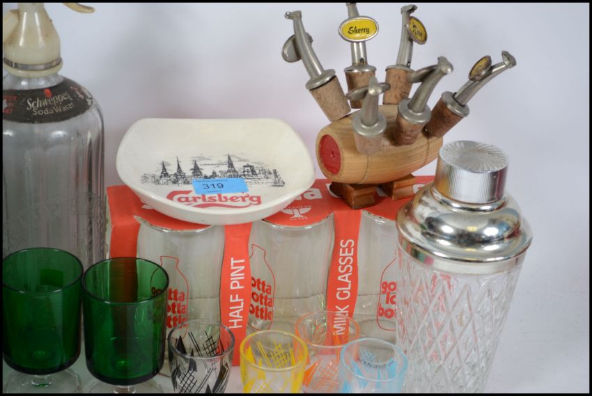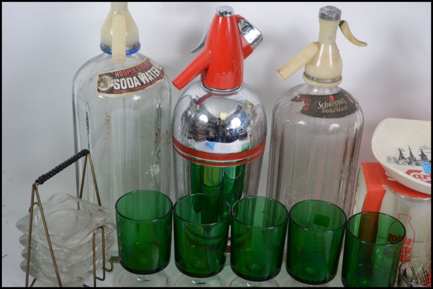 A collection of mid century / retro breweriana pub items to include soda syphons, glasses, shaker, forks etc