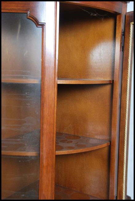 A tall antique Georgian style mahogany bow front corner display cabinet. Raised on a plinth base with twin full length glazed doors having shelved interior with flared cornice top. Measures:  200cms high x 75cms wide.