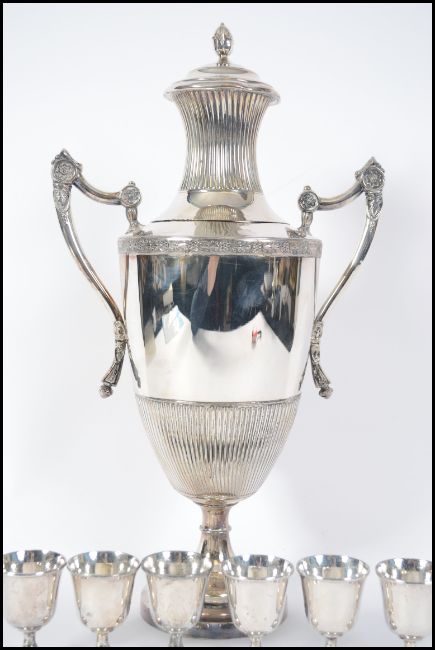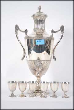 A good 20th century silver plated twin handled samovar with large finial lid over tap complete with 6 shot glasses