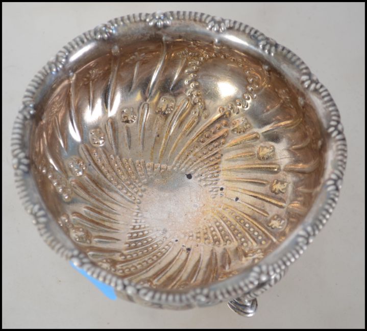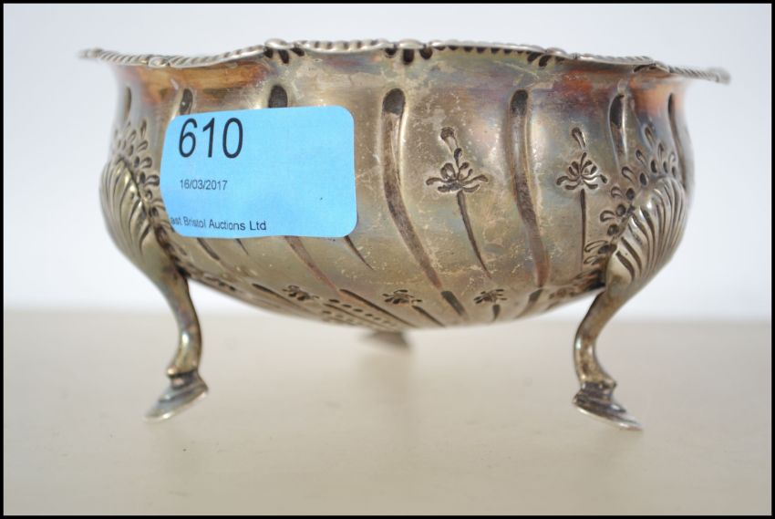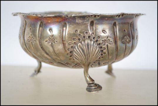 An unusual Edwardian silver hallmarked 3 footed Irish bowl Raised on hoof feet with ribbed decoration bearing Irish hallmarks to the base. Date letter K? for 1905 marked to centre underside for maker partially illegible. Total weight 194.1g