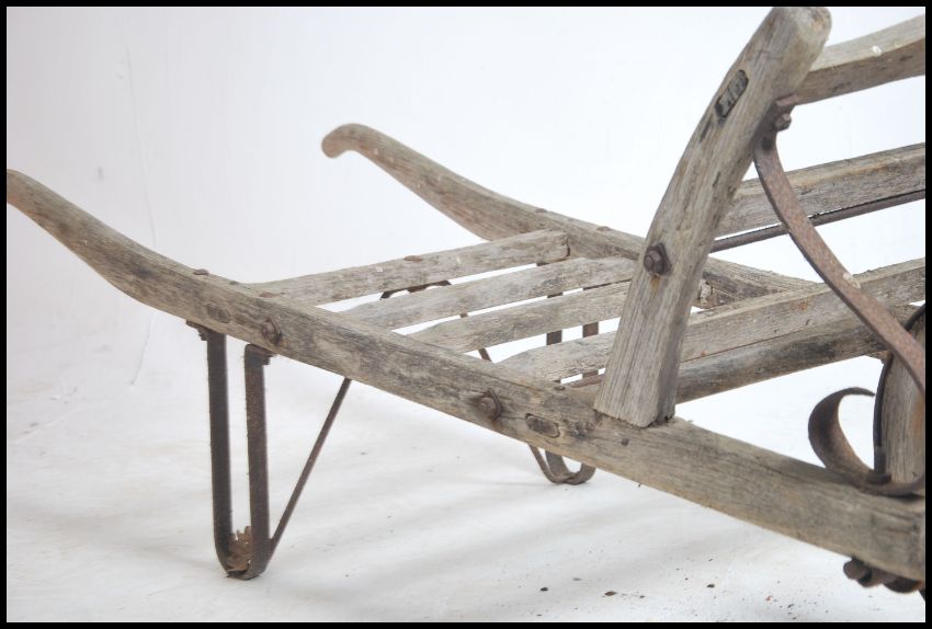 A vintage early 20th century single wheel wooden sack truck - porters trolley having a single wooden spoke constructed wheel, all of wooden construction