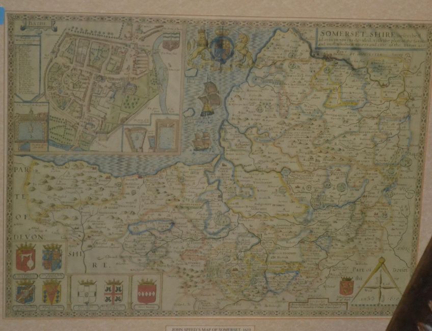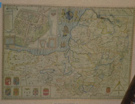A framed and glazed well mounted after John Speed map of Somerset ( Somersetshire ) circa 1610. Set within a pine frame