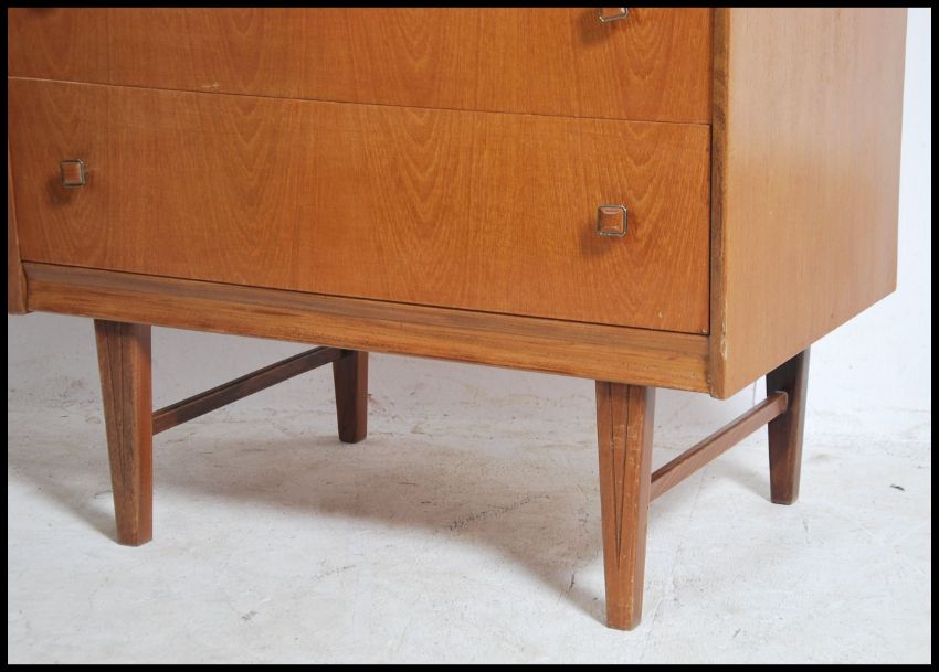 A 1970's teak wood Danish influence chest of drawers being raised on pedestal legs with a bank of drawers each with knob handles. Matching sideboard also available. Measures:  94cms high x 77cms wide x 47cms deep.