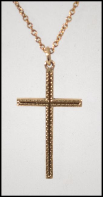 A 9ct gold rolo link necklace chain with spring hoop clasp having a 9ct gold crucifix pendant. Total weight 4.9 grams chain measures 16 inches. Makers mark B&S to crucifix both pieces marked 9ct.