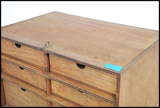 A scratch built engineers box dating to the 20th century. Constructed from ply with a fall front revealing a series of drawers. Measures:  46cms high x 48cms wide x 33cms deep.