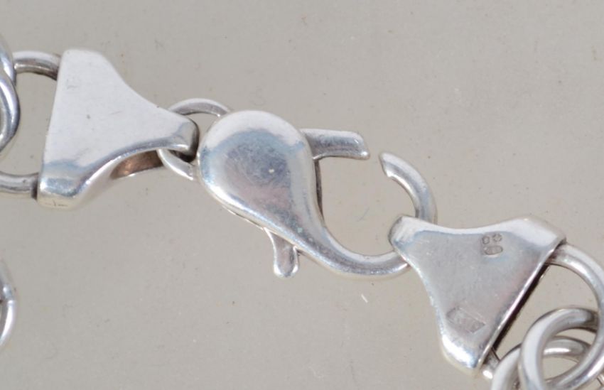 A collection of 4 silver bracelets to include double hoop with lobster clasp, charm bracelet with book, lock coin, m, graduating bar bracelet and another charm bracelet with dolphin etc. Total weight 68.5g