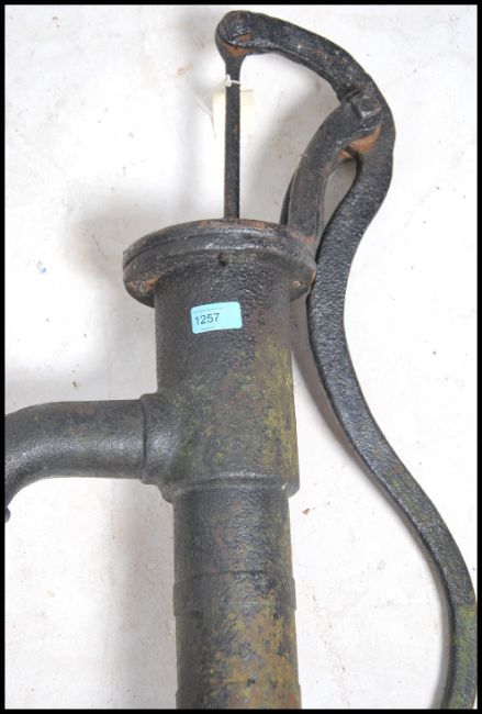 A good early 20th century cast iron water pump complete with shaped handle to the cylindrical body. Ebonised painted finish. Measures: 68cms high.