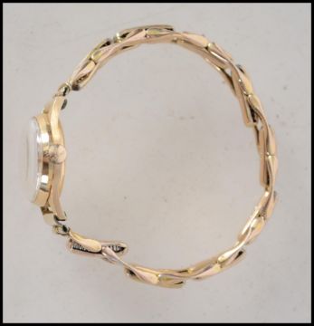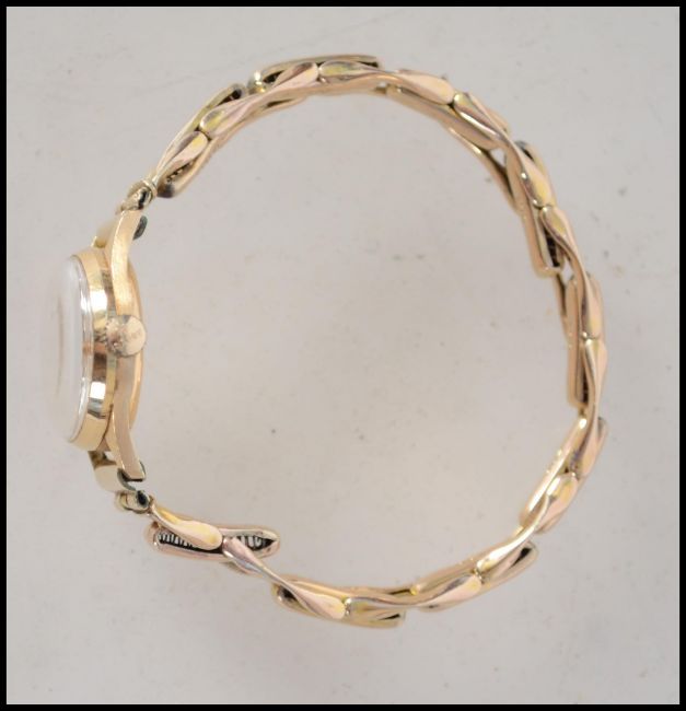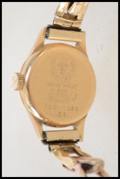 An 18ct gold ladies Cauny Prima Swiss made 17 ruby movement dress / cocktail watch having a silvered dial and a 9ct gold expanding bracelet. Marked 18ct to back makers mark to back No. 165 1368 34 bracelet stamped 9ct. Total weight 10.6 grams.