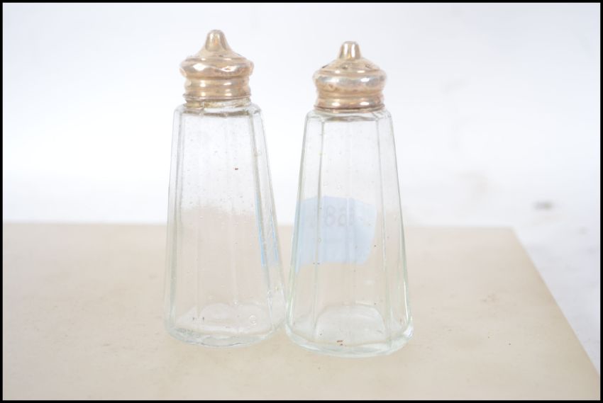 A pair of silver hallmarked and cut glass salt and pepper pot condiments. Hallmarked for Birmingham by David Lawrence ? 1918. Total weight 92.6g
