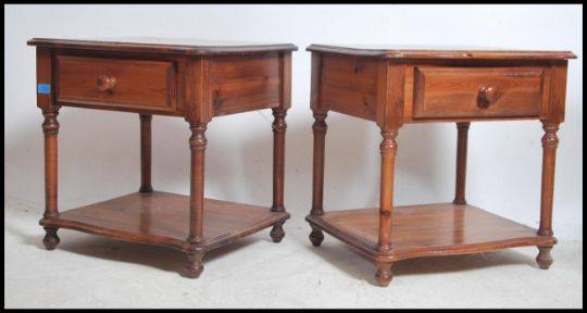 A pair of country pine bedside table - cabinets. Raised on turned legs with lower tiers having short drawers above. Measures:  52cms high x 52cms wide x 45cms deep.
