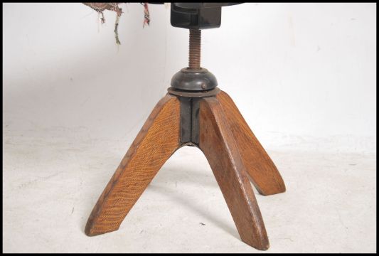 A 1920's Industrial oak clerks swivel office chair being raised on a quadruped base with overstuffed seat and back rest. Measures:  90cms high x 45cms wide x 44cms deep.