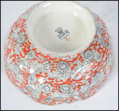 An unusual Masons Ironstone large  ceramic fruit bowl with decorative ochre red all over design being stamped to the underside with no 9440