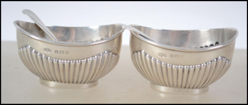 A pair of Edwardian silver hallmarked table salts having a Birmingham assay mark, marked for Joseph Gloster Ltd and dating to 1909. With a pair of matching silver spoons. Total weight 55g.