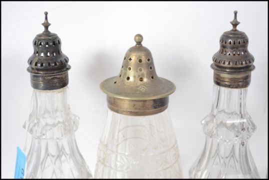 Group of four pieces of cut glass ware, three having hallmarked silver tops and one plated but well worn along with a turned glass inkwell with silver top; three sifters and an early glass bottle complete with stopper. Measures 14cm high.