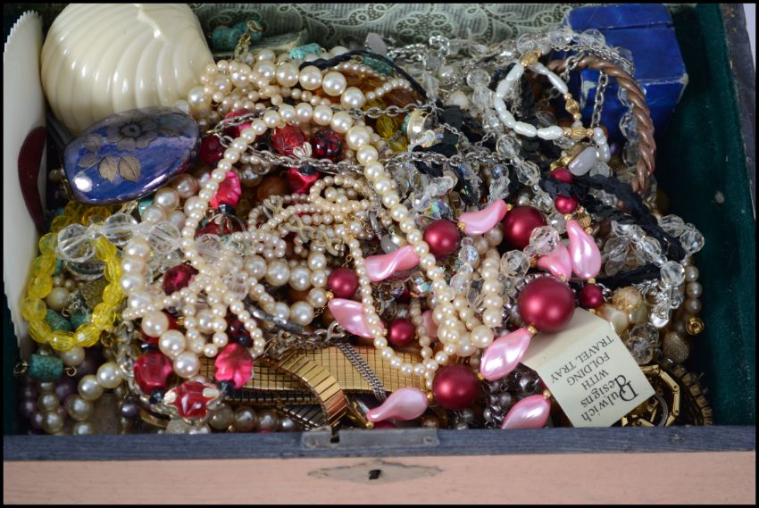 A fantastic and interesting collection of costume and dress jewellery to include watches, Czech style necklaces, bead necklaces rings various rhinestone earrings and clips, a pair of Art Deco goldtone bird clips etc. All held within a wooden jewellery casket having gilt decoration to lid.