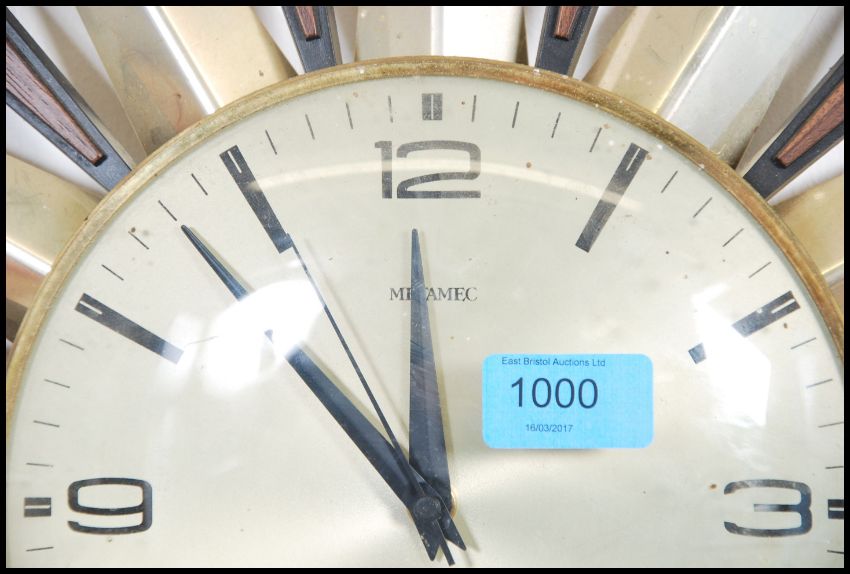 A vintage mid century sunburst retro wall clock with  teak and gilded metal rays with silvered dial having part baton numerals. Measures:  60cms high x 60cms deep.